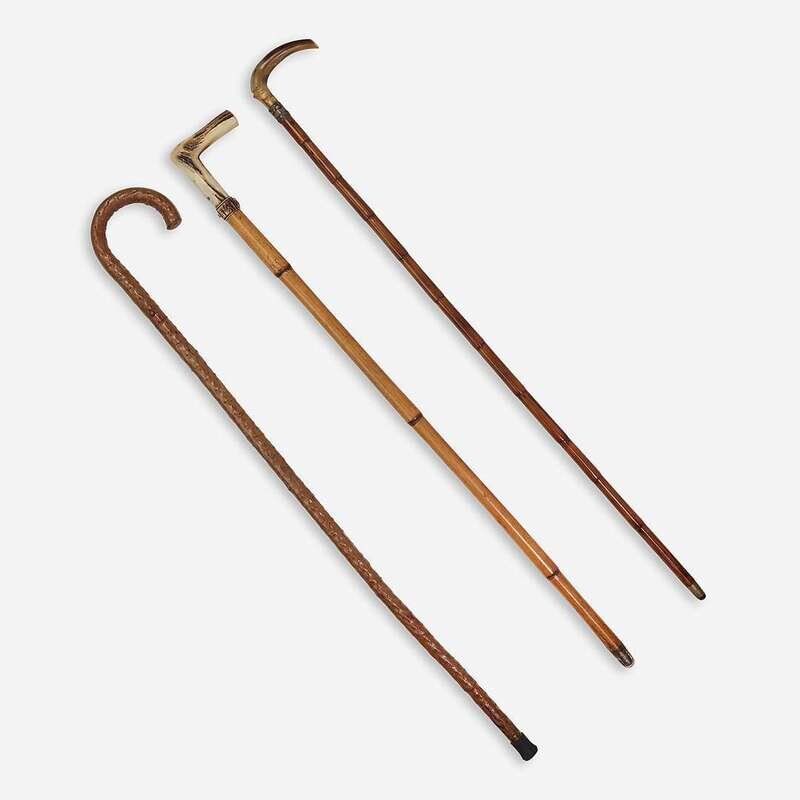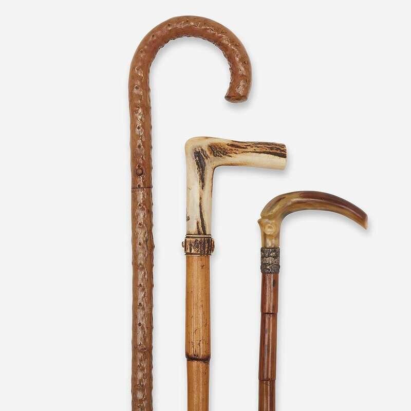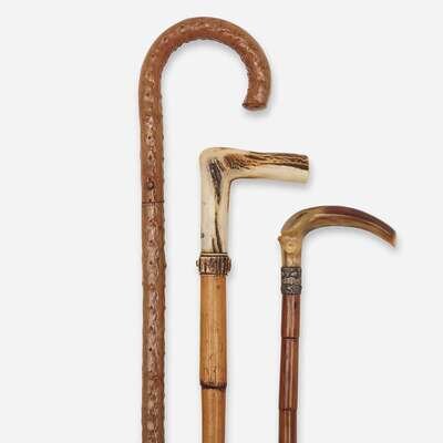 Comprising a briarwood sword cane, the release button at shaft releasing a 19 1/2-inch steel blade, apparently unmarked, with modern rubber ferrule over original brass ferrule; a French antler and bamboo sword cane, the release button at carved antler handle unsheathing a 30 1/4-inch steel blade, the blade marked "Coulaux & Cie Klingenthal France;" and Spanish silvered copper, horn, steel, and bamboo sword cane, the sword with etched steel blade marked "TOLEDO," the handle silvered copper, with carved horn ferrule. (3).