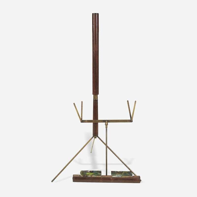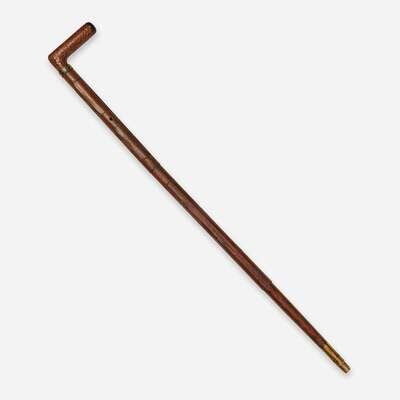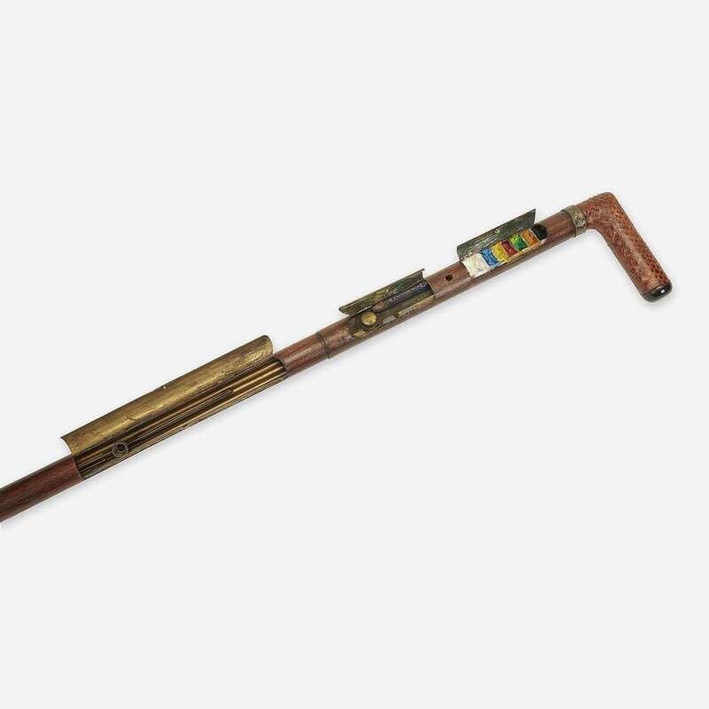 The angular snakeskin handle unscrewing to an empty cannister, the hinged compartments housing paint pigments, pencil, and inkwell, the cane reassembling to form an artist's easel, one brass rod for complete assembly now lost.