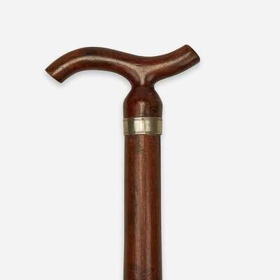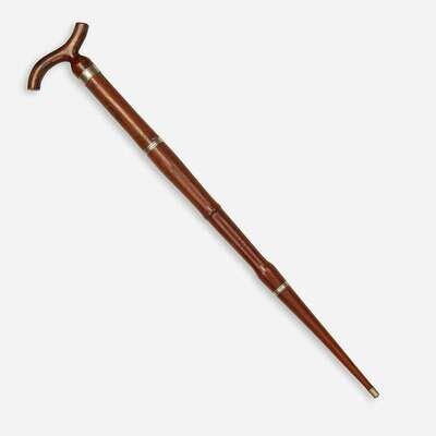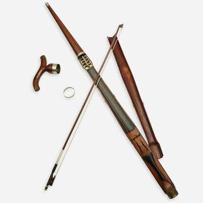 The tau-form handle unscrewing to compartment for bow, the silver mounts remove to open to violin, the wood with mahoganized finish, the silver apparently unmarked.