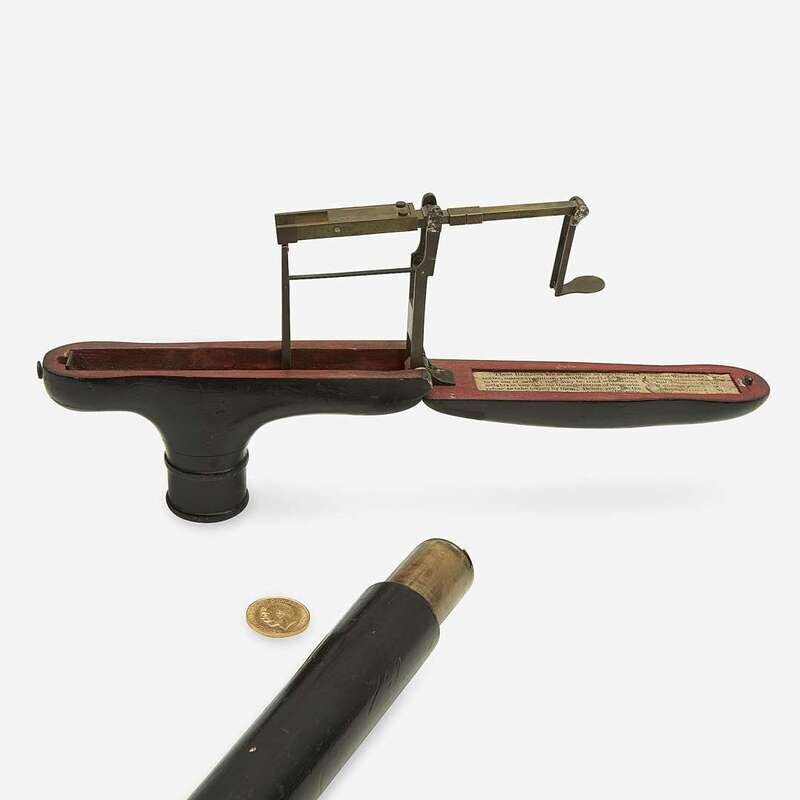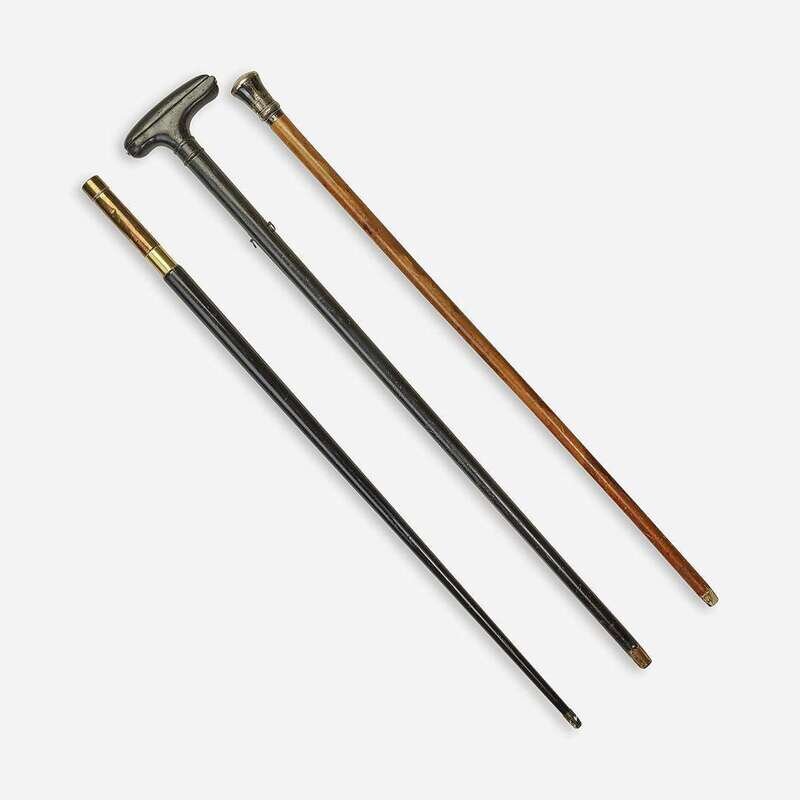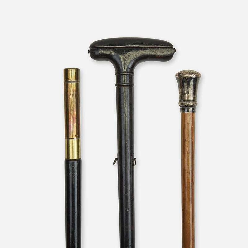 Comprising an English ebonized wood systems cane, the handle opening by hasp to reveal balance, the handle removing from shaft to reveal coin dispenser, the shaft with two hinged compartments, one with glass vial, the other with match strike, the balance by Stephen, Houghton & Son, Ormskirk, England, sold together with a 1911 Great Britain gold Sovereign "George V" coin, 5 dwt.; a French brass-mounted gilt metal and ebonized wood systems walking stick, the handle opening to compartment lined with felt and storing a barometer; and a silver-mounted malacca measure walking stick, the handle unscrewing to reveal compartment containing a caliper, the handle monogramed "LH," the silver apparently unmarked, missing ferrule. (3).