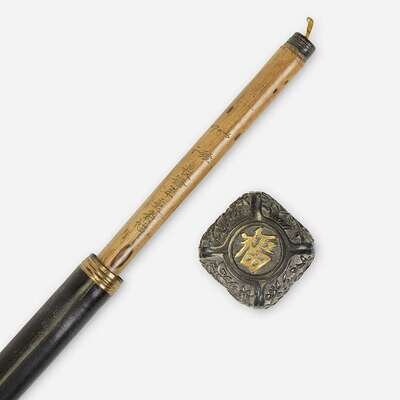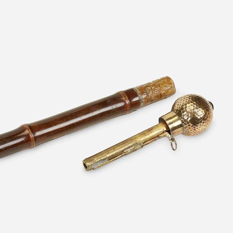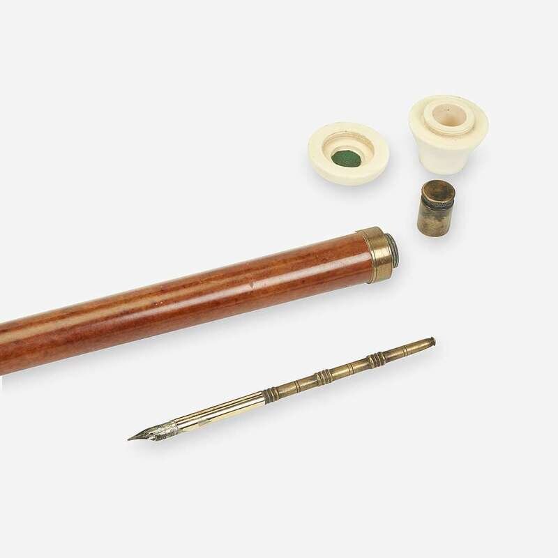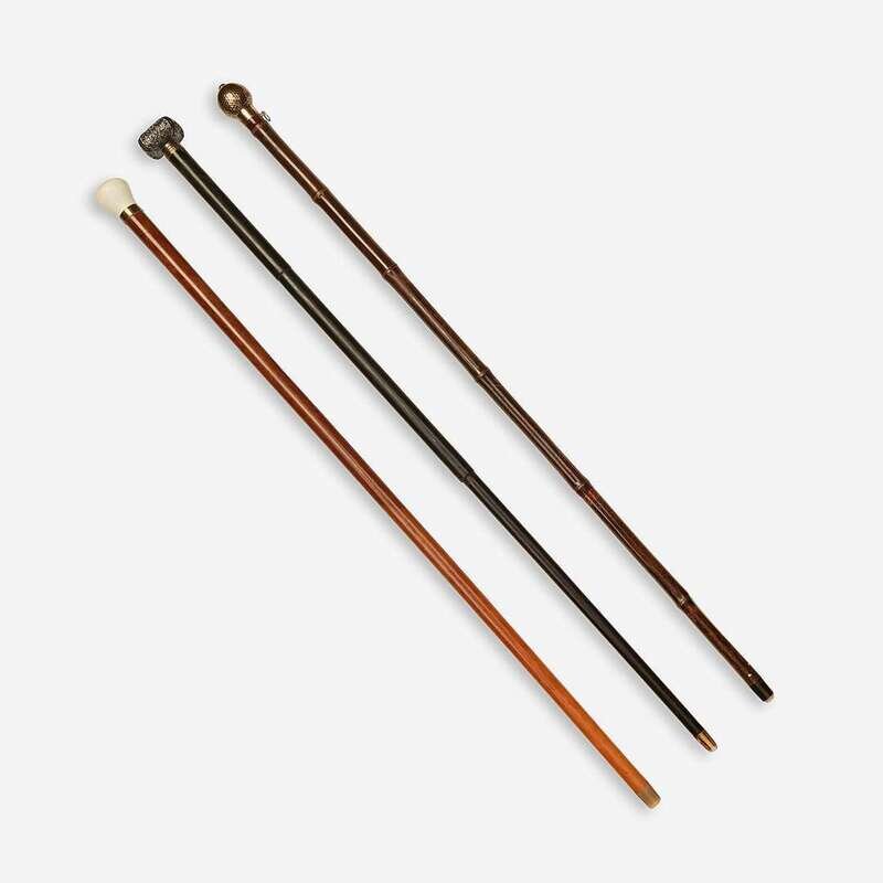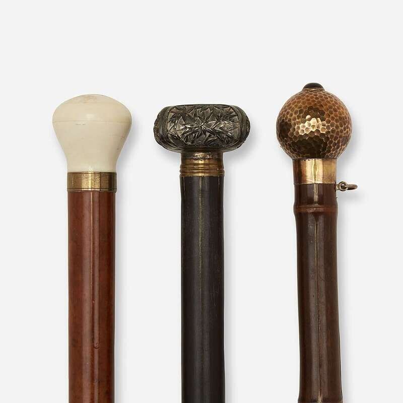 Comprising a Japanese brass-mounted silver and ebonized bamboo calligrapher's cane, the handle unscrewing to reveal ink brush, ink stick and stone, with brass ferrule; a gilt brass-mounted brass and bamboo systems walking stick, a lever releasing a jet cabachon-capped pencil from hammered brass handle; and a brass-mounted celluloid and malacca systems walking stick, the celluloid handle containing an inkwell and unscrewing to reveal a fountain pen, with faux horn ferrule. (3).