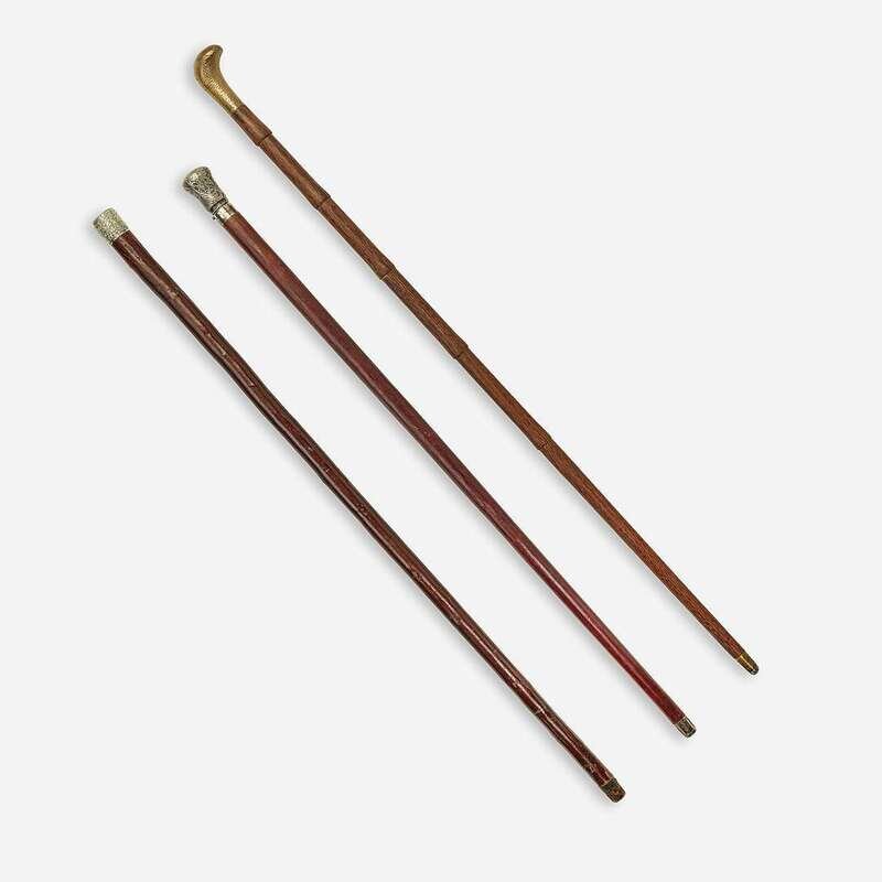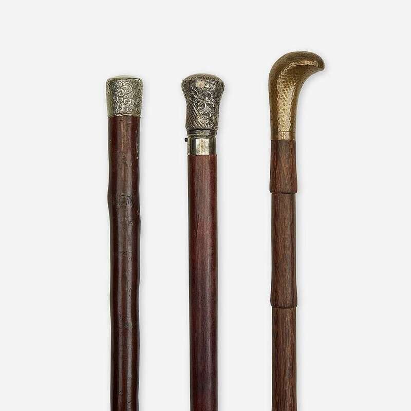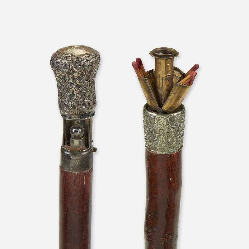 Comprising a silver and hardwood light bulb cane, the release button revealing light bulb, the silver handle marked with French patent mark and an indistinct French silver mark, the handle unscrewing to compartment fitted with contemporary batteries to operate light bulb; a brass and hardwood light cane, the hammered brass handle releasing to reveal match safe compartment, the faux painted bamboo shaft releasing in two parts to reveal brass key and candle; and a silvered metal and bamboo systems walking stick, the filigree handle opening to reveal a candle compartment above pop-up match safe, the underside of hinged lid marked "Patent/No 2048." (3).