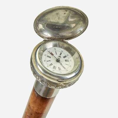 The first a brass and mahogany watch walking stick, the handle inset with watch; the second a white metal and malacca watch walking stick, the hinged lid decorated with insect motif opening with release button to watch face, the underside of lid stamped "9438 20 I," with brass ferrule. (2).
