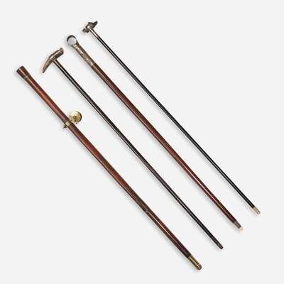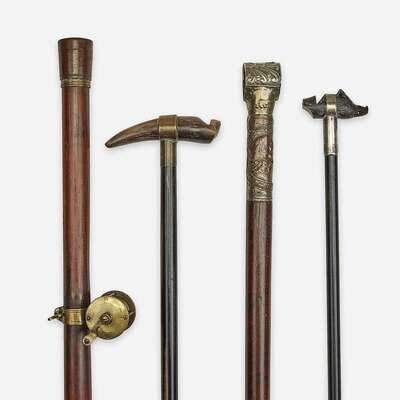 Comprising a silvered copper and fruitwood crop walking stick, the handle unscrewing to reveal leather-wrapped riding crop, the handle decorated with equestrian and pastoral scenes, with ivory ferrule; a brass-mounted horn and ebony whistle cane, the handle a carved horn whistle; a silver or silver plate-mounted resin and ebonized wood whistle cane, the resin handle in the form a boar with glass-set eyes, the silver apparently unmarked, with faux horn ferrule; and a brass-mounted hardwood fishing rod walking stick, the ferrule unscrewing to extending telescoping bamboo fishing rod. (4).