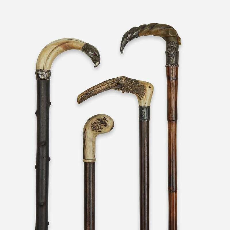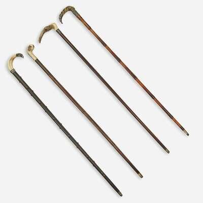 Comprising a Continental silver-mounted boar tusk and briarwood cane, the handle terminating in silver eagle head with ruby-set eyes, the silver apparently unmarked; a silver-mounted carved antler and macassar cane, the silver apparently unmarked; a sterling silver-mounted carved horn and bamboo cane, the silver stamped "FINE 92.5/100," possibly Indian; and a carved antler and macassar collapsible walking stick, the handle unscrewing to reveal button hook, the shaft unscrewing in four places to become collapsible, with horn ferrule. (4).