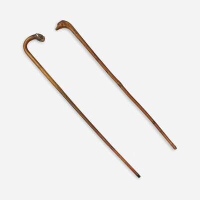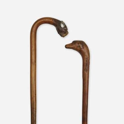 The first a Victorian malacca cane, the handle in the form of a dog head with silver-mounted ears and eyebrows, glass-set eyes, and carved horn snout; the second a burled wood cane, the handle carved in the form of a dog head with pin-set eyes, carved "M.CASIMIRO" and "CAWALIS" to shaft. (2).