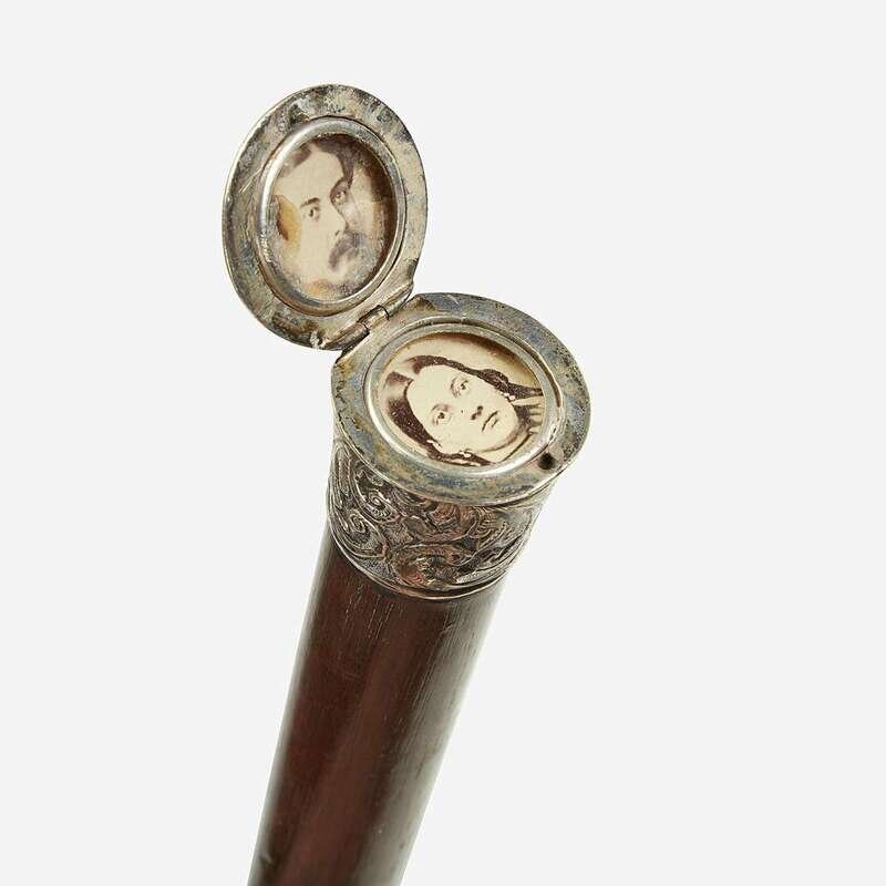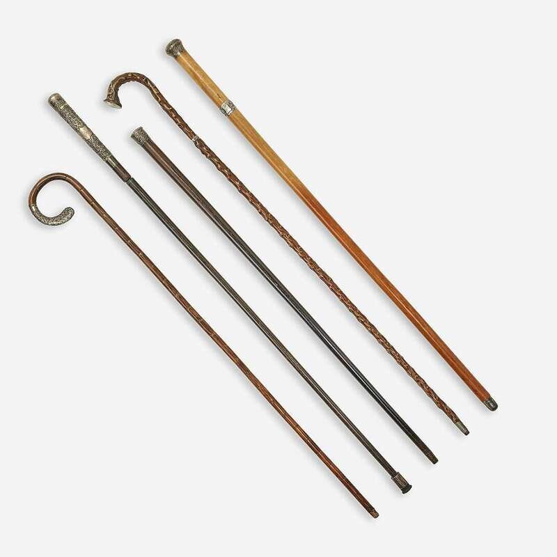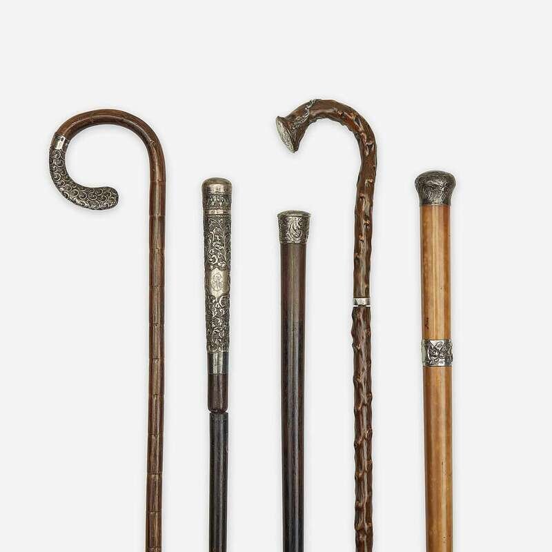 Comprising a silver-mounted faux grained briarwood cane, monogramed "ESD" to handle terminal; an English silver-mounted bamboo cane, the handle terminal engraved "Wm Spencer," the silver marked with maker's mark JA, Birmingham, 1908, missing ferrule; a silver and malacca walking stick, the silver handle decorated in the rococo style, the white metal collar with with blank cartouche, the silver apparently unmarked; a silver and mahogany walking stick, the silver handle with shield reserve monogrammed "ME," the silver apparently unmarked, with modern rubber ferrule; and a Victorian silver-mounted ebonized wood photographic walking stick, the handle opening to reveal two photographic portraits, one of a man the other a woman, the silver marked with maker's mark JH, Birmingham, 1888. (5).