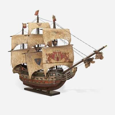 Carved wood, rope rigging, and plastered canvas sails, the sails decorated with the Arms of Castile and dated 1541, mounted on later custom mahogany stand.