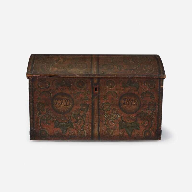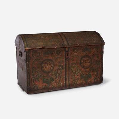 A Spanish Colonial polychrome painted traveling trunk Dated 1842