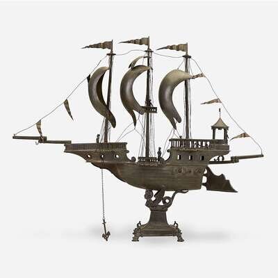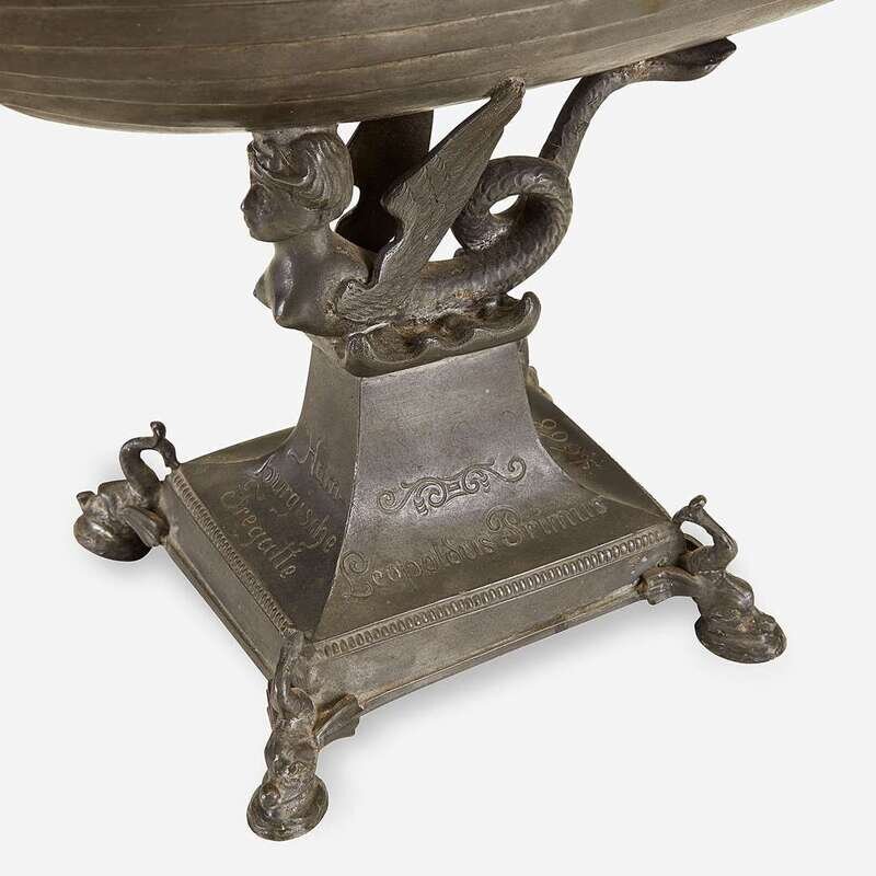 The three-masted convoy ship realistically modeled and labeled in cast to three sides of base: "Leopoldus Primus," "Hamburgische/Fregatte," and "erbaut/im Jahre/1668," and with the Hamburg coat of arms.