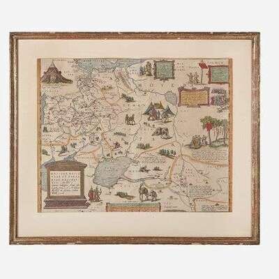 Circa 1570-1612. Hand-colored engraving. Latin text on verso. Margins trimmed close to plate mark, recto and verso slightly darkened, verso soiled, center fold verso reinforced with tape, dampstaining at top corners verso. 14 1/2 x 18 1/2 in. (368 x 469 mm). In frame.