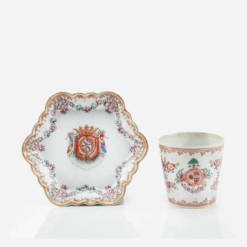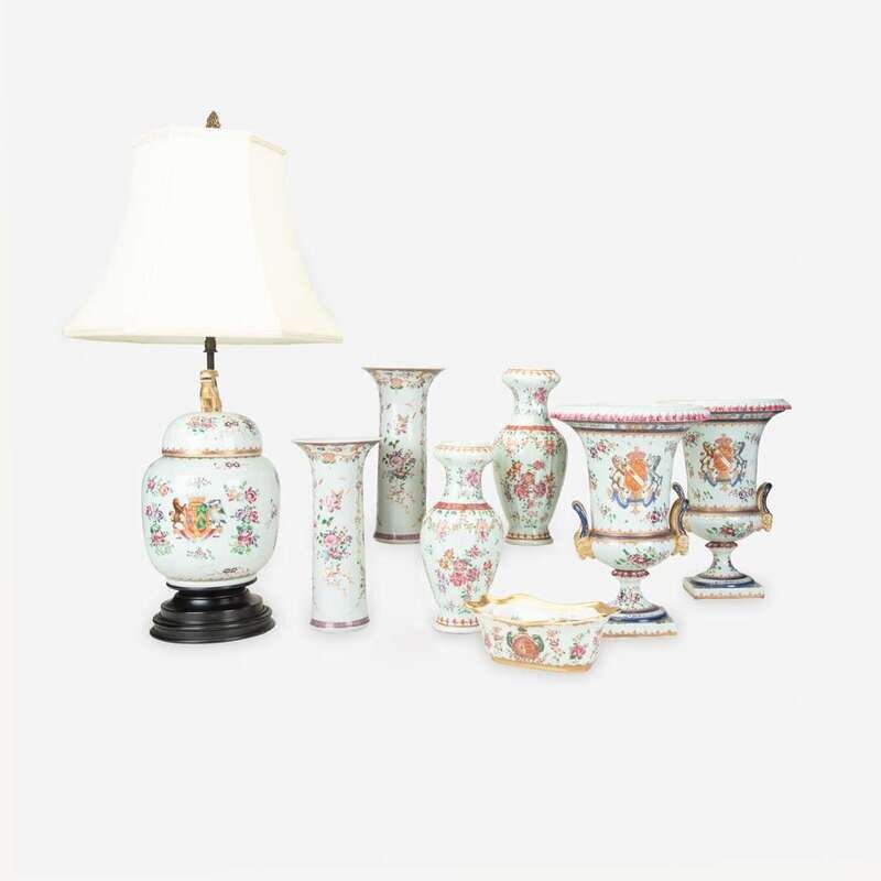 Comprising a pair of campana urns, a pair of beaker vases, a pair of ribbed baluster vases and a covered ginger jar mounted as a lamp; sold together with a small Samson shaped candy dish, cup, and shaped dish. (10).