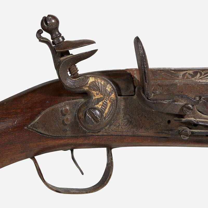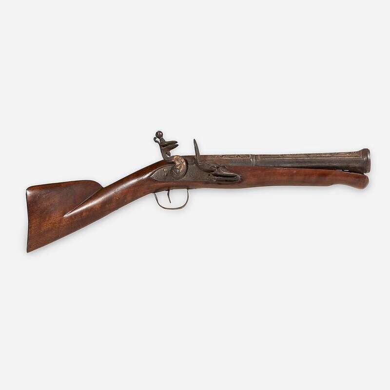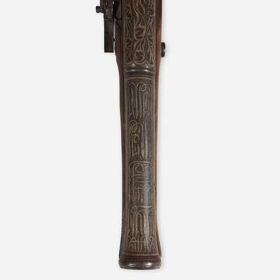 Flared from the middle to the muzzle and thickened beveled breech, the smoothbore iron barrel decorated with engraved foliate motifs, seated in a carved wood stock.