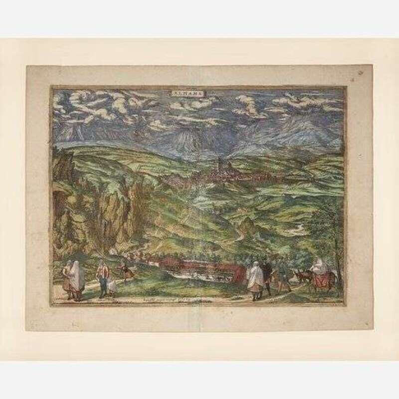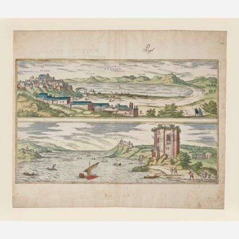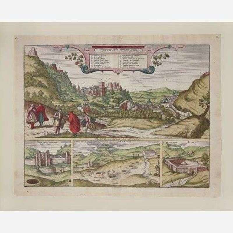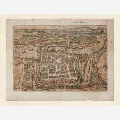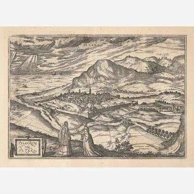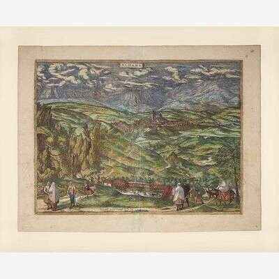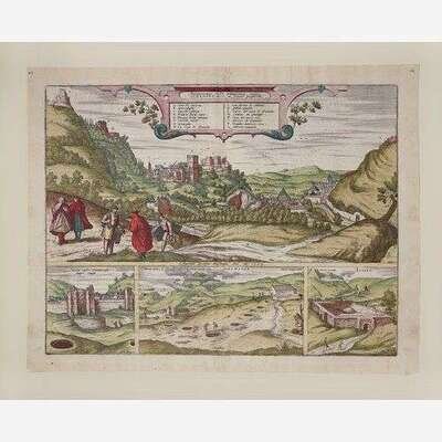 1. Amoenissimus castri Granatensis, vulgo Alhambre dicti, ab Oriente prospectus (Cologne, ca. 1598). Hand-colored engraving. Latin text on verso. Center fold verso reinforced with tape. 16 x 20 1/2 in. (406 x 520 mm). Hinge mounted, in mat. 2. Alhama (Cologne, ca. 1574). Hand-colored engraving. Latin text on verso. Center fold verso reinforced with tape; scattered minor soiling. 16 1/8 x 21 1/8 in. (409 x 536 mm). Hinge mounted, in mat. 3. Puteoli (Cologne, ca. 1580s). Hand-colored engraving. Latin text on verso. Margins trimmed, soiling to same. 16 1/2 x 20 1/8 in. (419 x 511 mm). Hinge mounted, in mat. 4. Alten Stettin (Cologne, 1581). Hand-colored engraving. Latin text on verso. Center fold verso reinforced with tape; recto and verso toned; scattered soiling; some chipping along edges; some marginalia in Arabic. 16 1/2 x 21 1/4 in. (419 x 539 mm). Hinge mounted, in mat. 5. Pisaurum Vulgo Pezaro (Cologne, ca. 1580s). Uncolored engraving. Latin text on verso. Center fold verso reinforced with tape; dampstaining along bottom left edge; slightly darkened. 15 1/2 x 21 1/4 in. (393 x 539 mm). Hinge mounted, in mat.