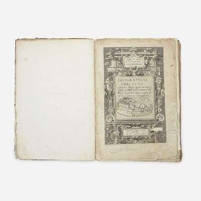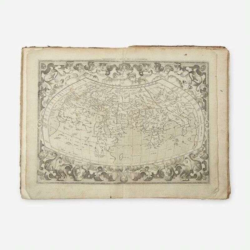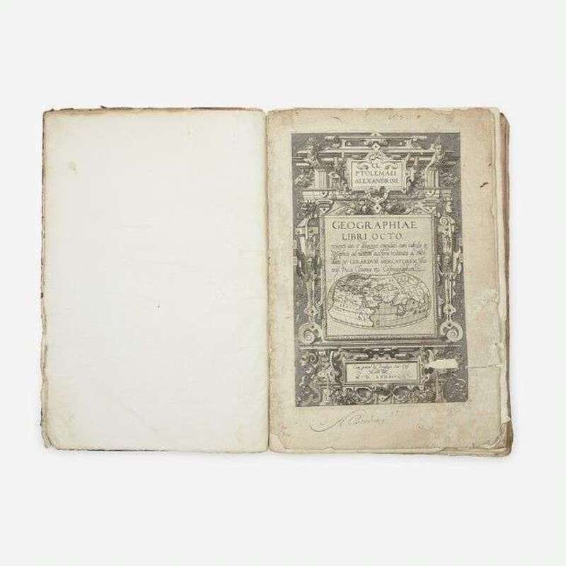 (Cologne: Godfried von Kempen, 1584). Second edition. Edited by Arnold Mylius. Folio (409 x 279 mm). (ii), 106, 89-90, (30), (1) (blank), (142) pp. Illustrated with engraved title-page, numerous in-text woodcut diagrams, and 27 (of 28) maps; lacking map III of Europe ("Continent Galliae, Graecis..."). Full eighteenth century calf, stamped in gilt, boards heavily worn and soiled, spine perished, remnants of later repair along spine and joints; all edges trimmed; engraved title-page worn and soiled, repairs on verso, 3 1/2 in. separation along repair at bottom corner, old ownership signature at foot of same; bottom corner of first 14 leaves tattered with varying loss to text; light to moderate dampstaining in bottom corners of maps VII-XII; fore-edge of final seven leaves worn; scattered minor spotting and worming to text and plates, scattered chipping and short closed tears along edges of same; several leaves and maps sprung. Sabin 66491. Sold with all faults. Gerard Mercator's (1512-94) second edition of Ptolemy's Geography, and the last edition produced in his lifetime.
