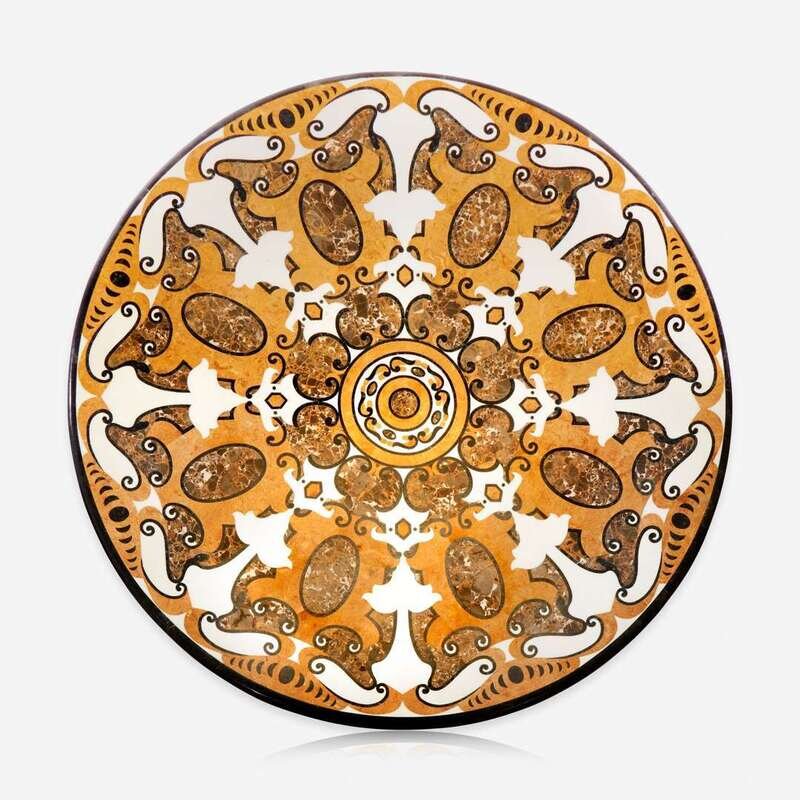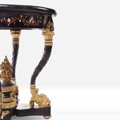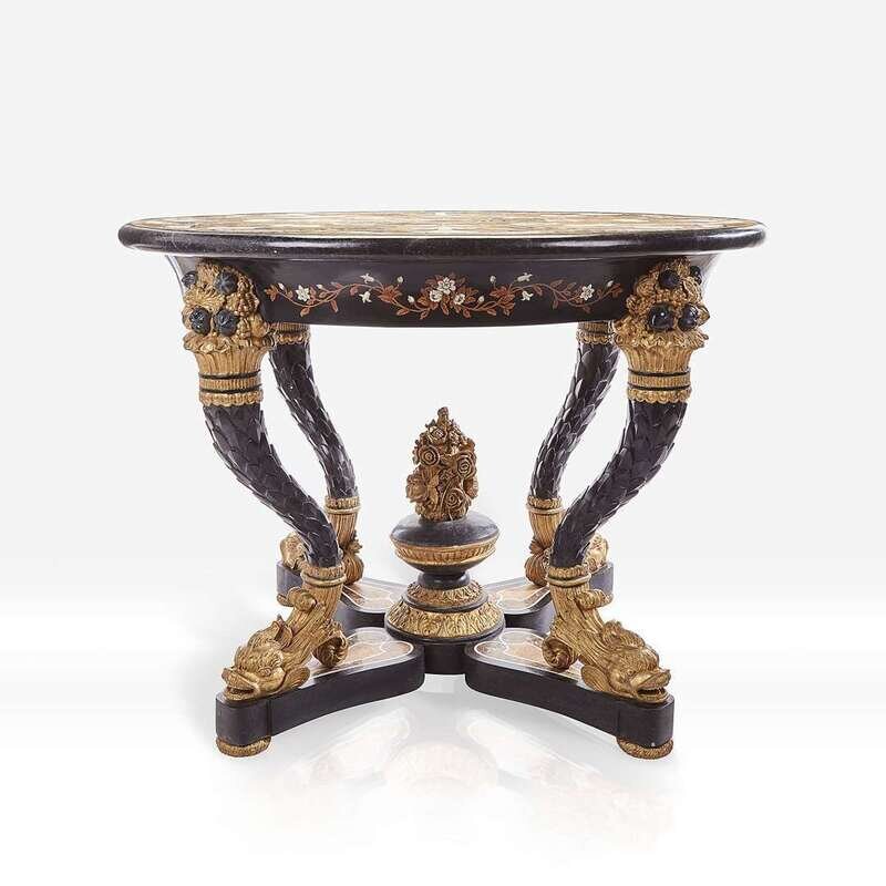 The top inlaid with specimen marbles in a Renaissance style scroll and cartouche motif, the apron painted with faux marble floral vines, the whole raised on four gilt and ebonized wood dophin-form legs united by X-form marble-veneered stretchers terminating in floral gilt and ebonized wood floral urn.