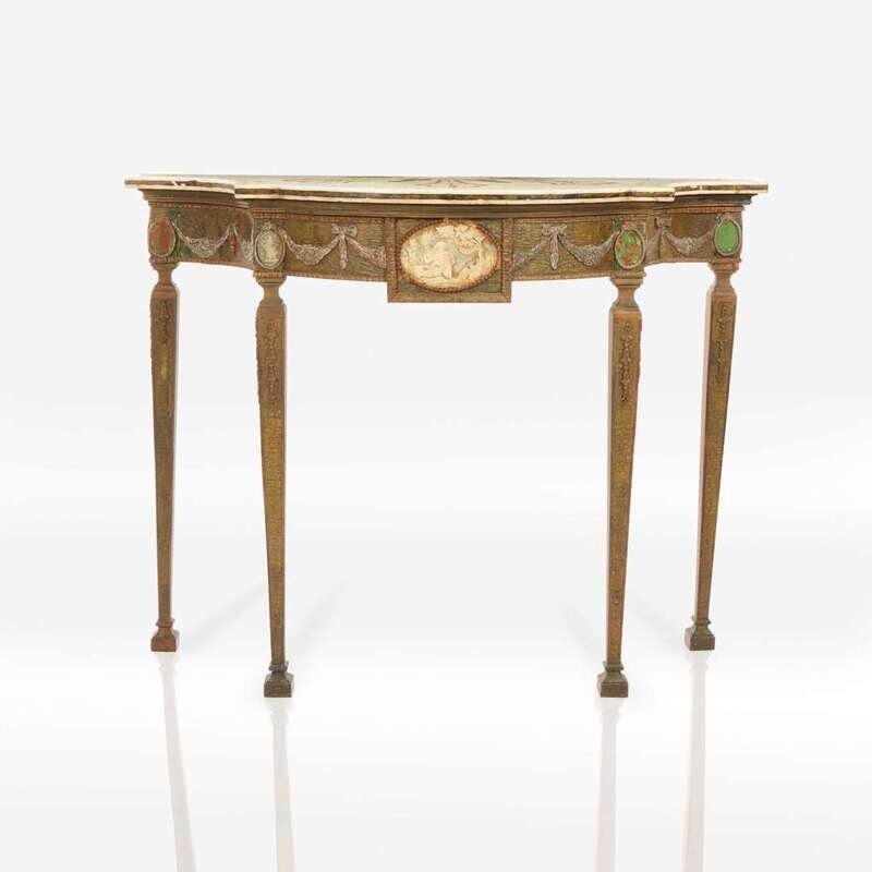 A George III Adamaesque polychrome decorated console with scagliola and white marble top Circa 1800