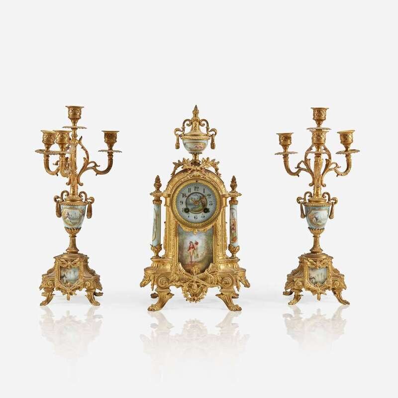 A Napoleon III Sèvres style porcelain-mounted gilt-metal three-piece clock garniture Japy Frères, Paris, third quarter 19th century