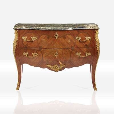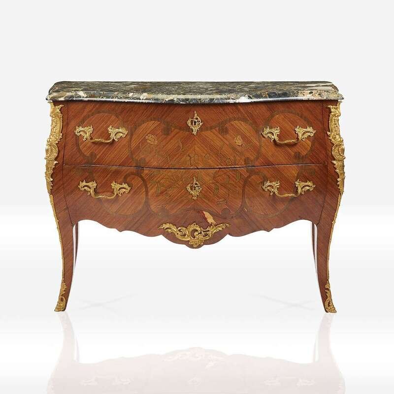 A Louis XV style gilt-metal mounted fruitwood marquetry and kingwood parquetry bombé commode with marble top Late 19th/early 20th century