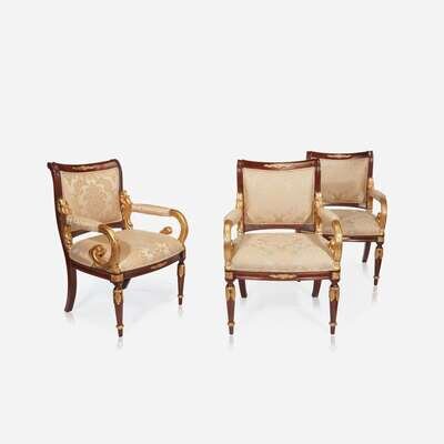 Three Charles X style parcel-gilt mahogany fauteuils 20th century