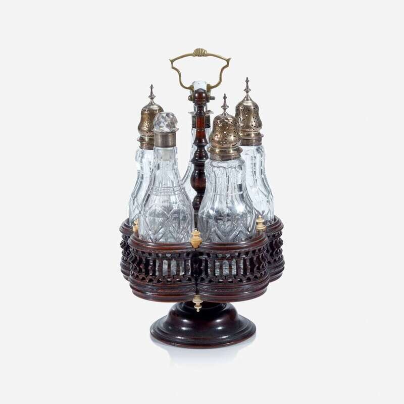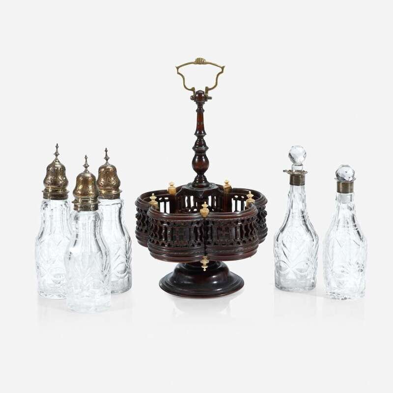 A William IV/Victorian silver mounted cruet set with brass-mounted mahogany stand Maker's mark TC possibly for Thomas Callow, Birmingham, circa 1840-50