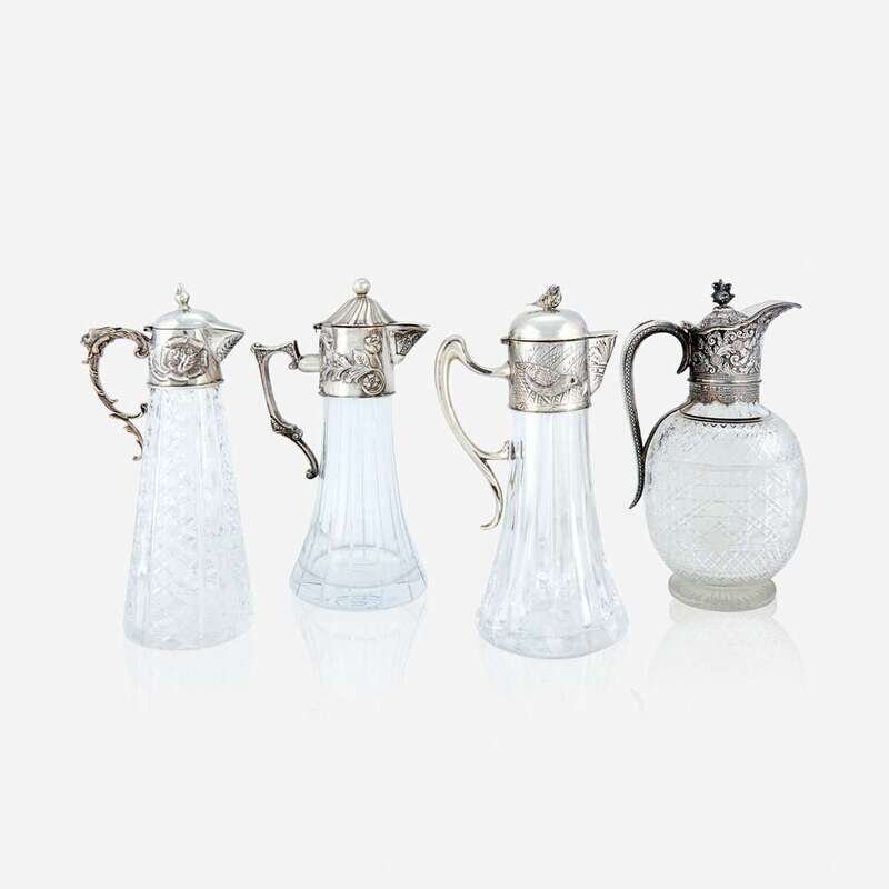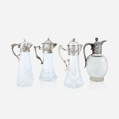 Comprising a Victorian silver-mounted and cut-glass claret jug, Horace Woodward & Co., London, 1887-88; and three Continental cut-glass and .950 standard silver-mounted claret jugs. (4).