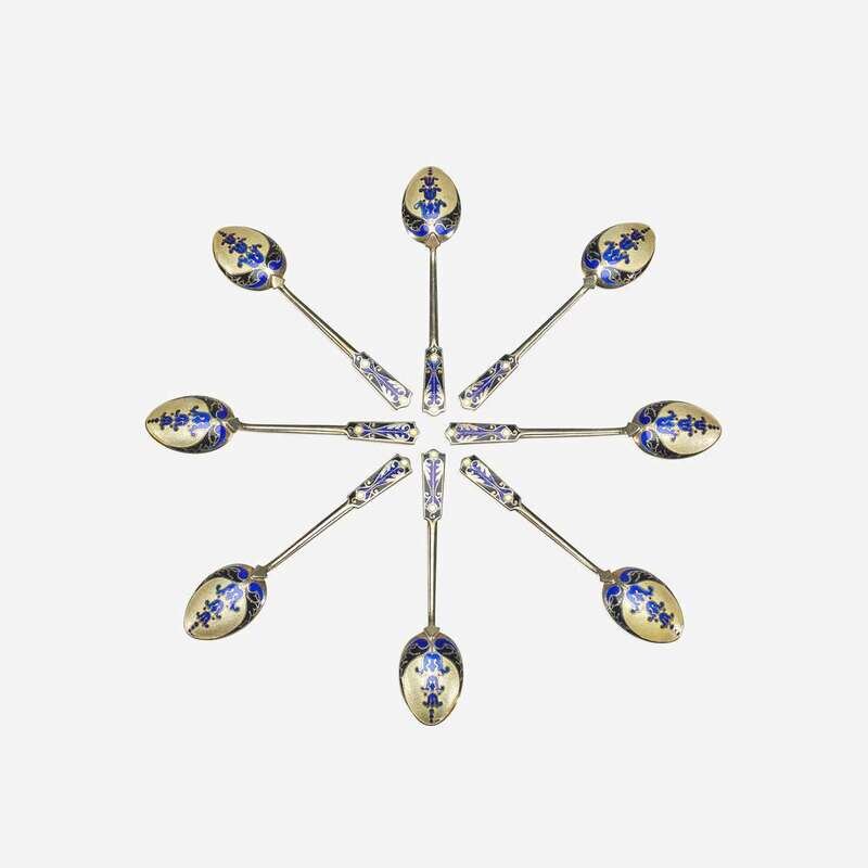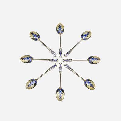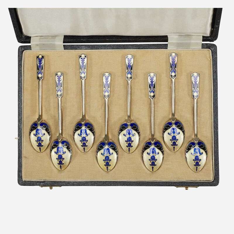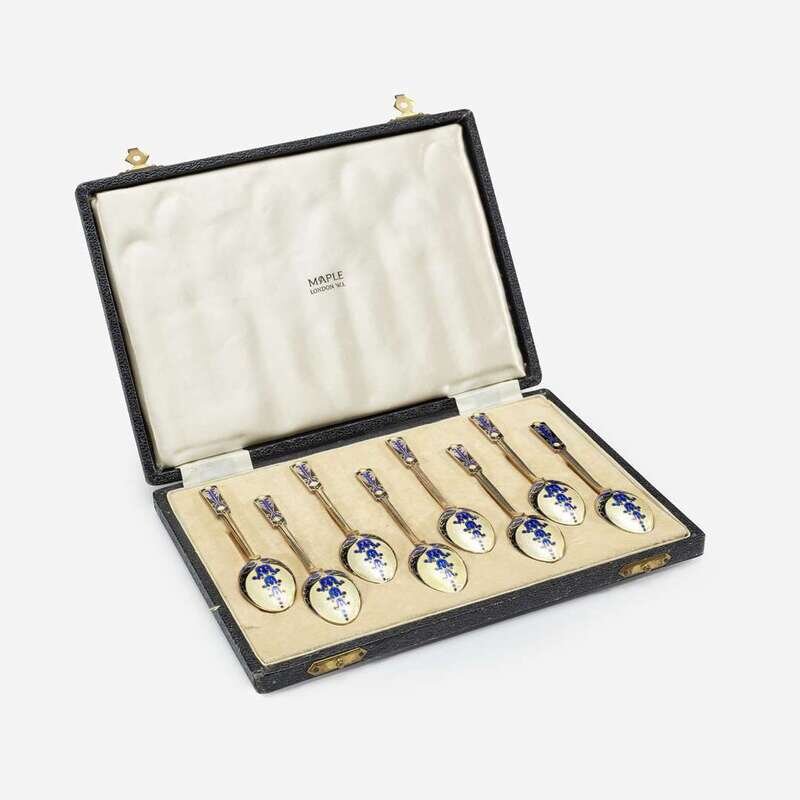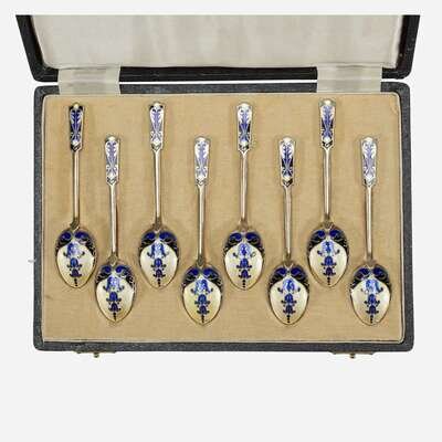 A cased set of English enameled sterling silver demitasse spoons Turner & Simpson, Birmingham, early 20th century