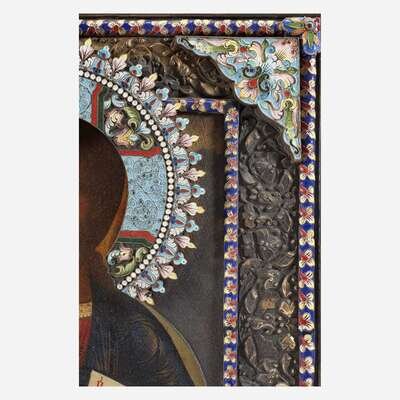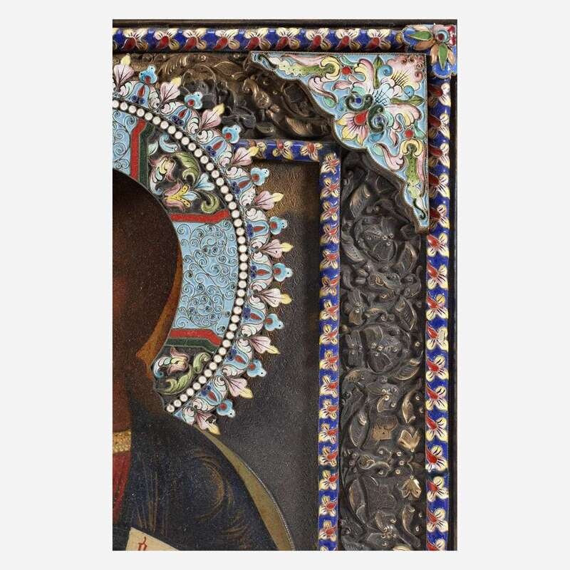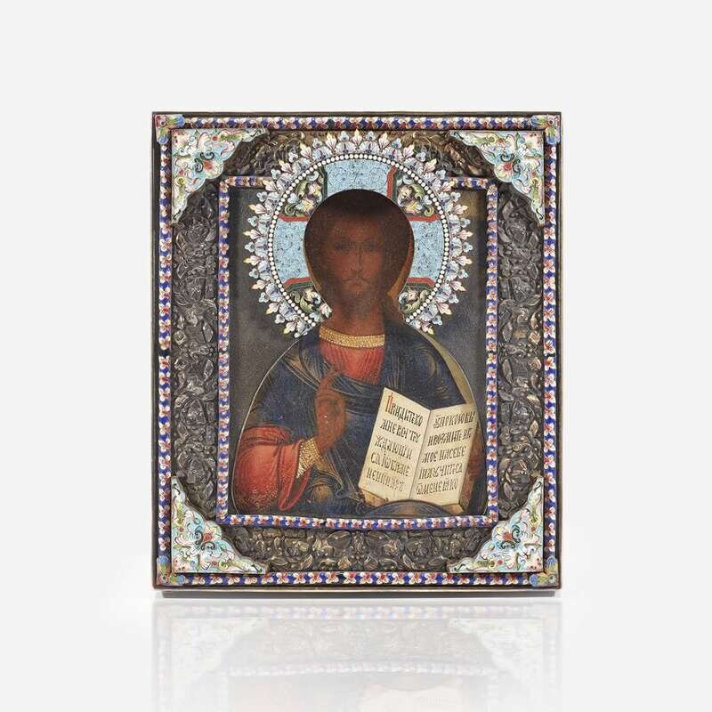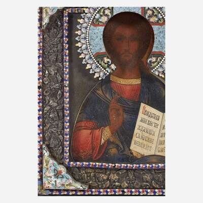 A Russian silver and cloisonné enamel icon of Christ Pantocrator Unknown maker marked in Cyrillic SG, probably Pensa,19th century