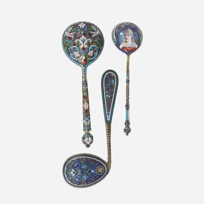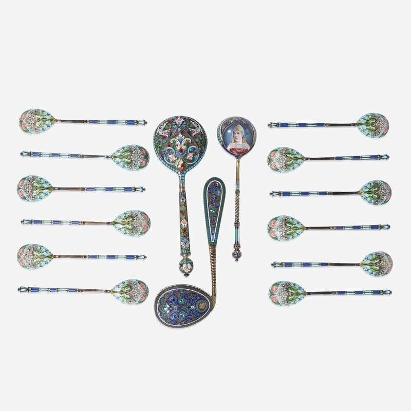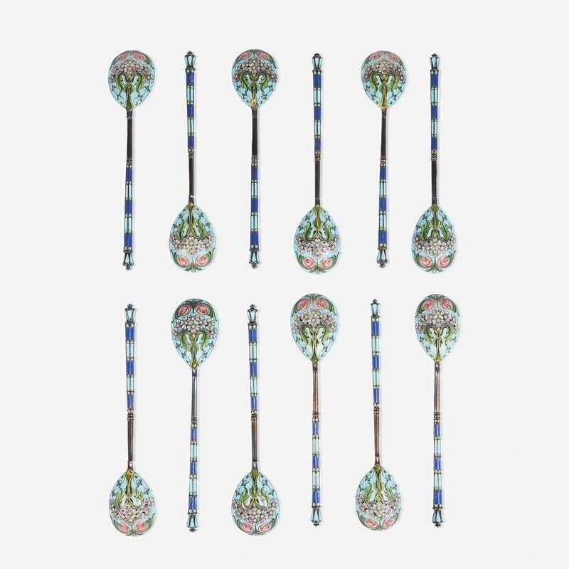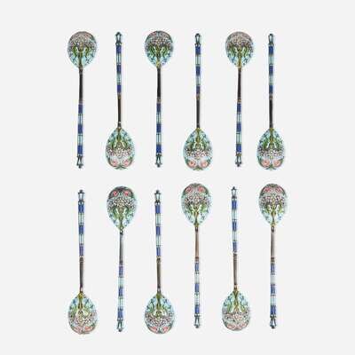 A group of twelve Russian silver-gilt and cloisonné enamel spoons Ivan Khlebnikov, Moscow, circa 1900
