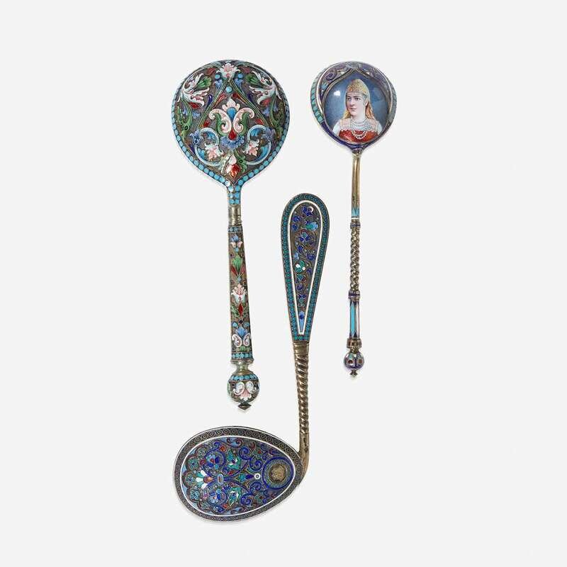 Together with three Russian cloisonné enamel spoons, all stamped to handles. (15).