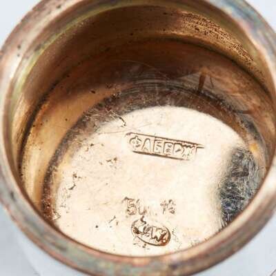 Of traditional form, mounted with a cabochon Mecca stone, the rim surrounded by pearls, the body enameled translucent white over a wavy engine-turned ground, the base unscrewing, interior marked with 56 zolotniki mark, maker's mark FABERGE in Cyrillic and workmaster's mark H.W in Latin for Henrik Wigström, the base with scratched inventory number 4890, sold together with a fitted Apsrey box.