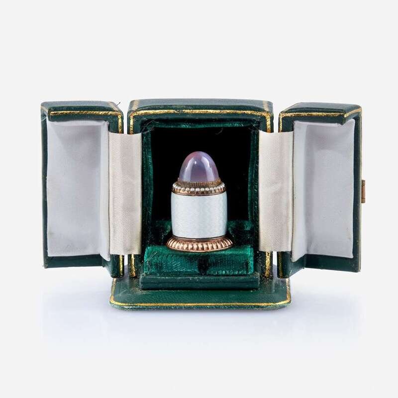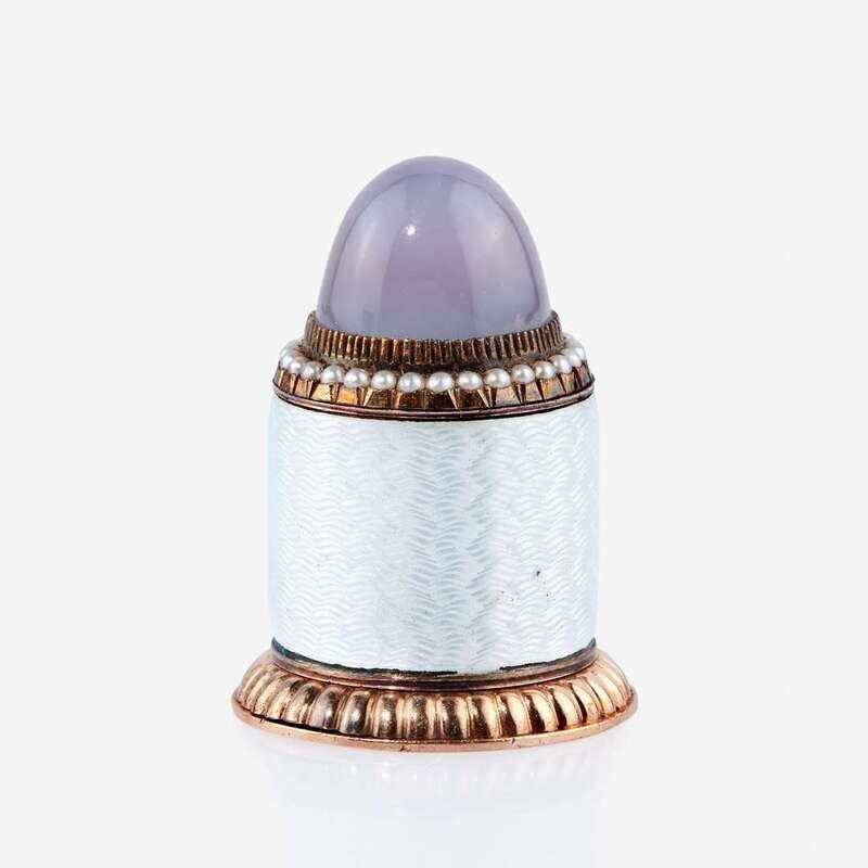A Fabergé gem-set 14-karat gold and guilloché-enameled thimble case Workmaster Henrik Wigström, St. Petersburg, circa 1900