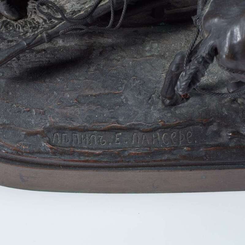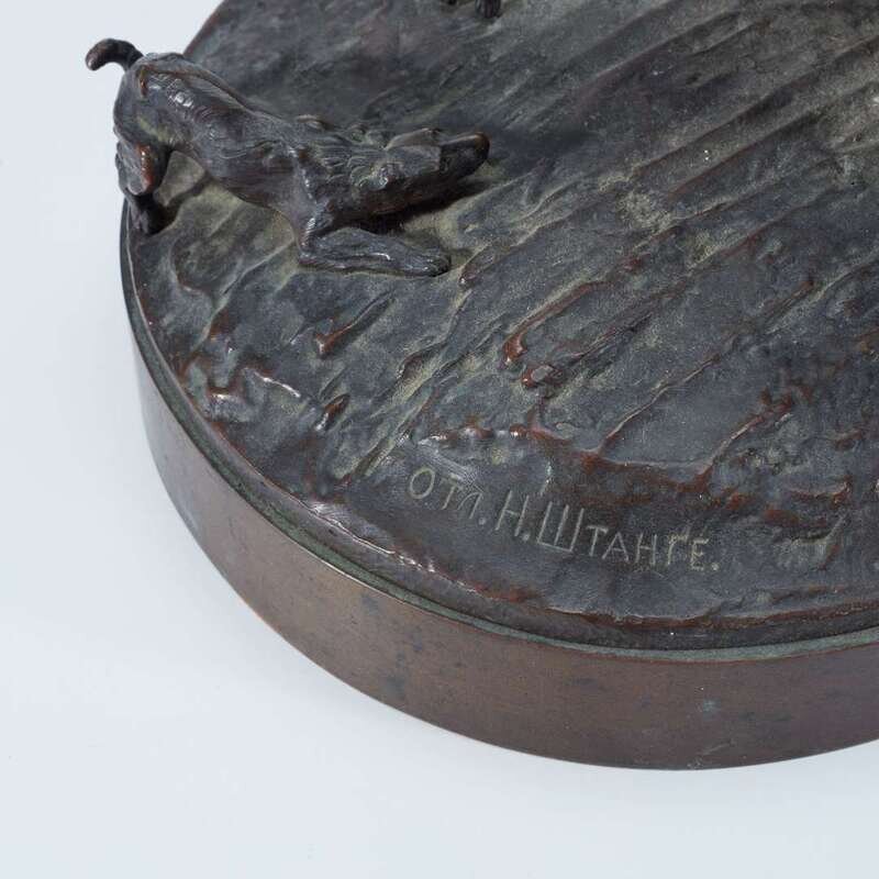 Bronze, dark brown patina, signed in cast in Cyrillic and with Schtange foundry mark.