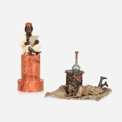 Comprising an inkwell in the form of a smoking boy, the table lid opening to reveal a porcelain inkpot, stamped "GESCHÜTZ/3412" and with vase mark to carpet; and a paperweight of a reading boy on marble base, stamped "2746" and with vase mark to back. (2).