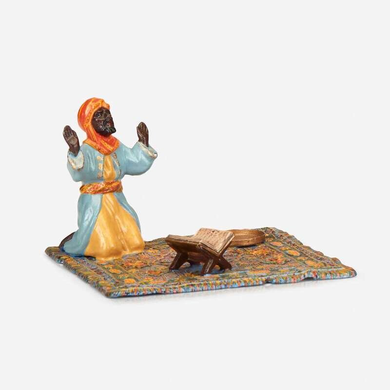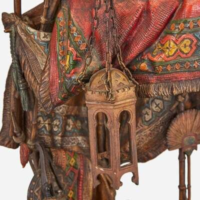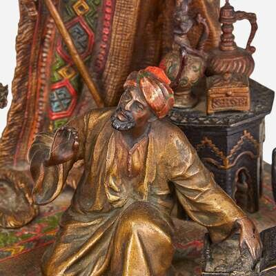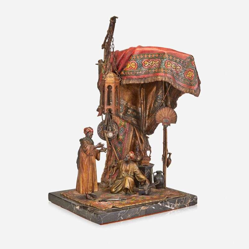 Now mounted to marble base, stamped "AUSTRIA" to one tent pole; sold together with an Austrian cold painted bronze figure of a praying man, marked to underside "TRADE MARK 'CORONET'/REGISTERED AUSTRIA." (2).