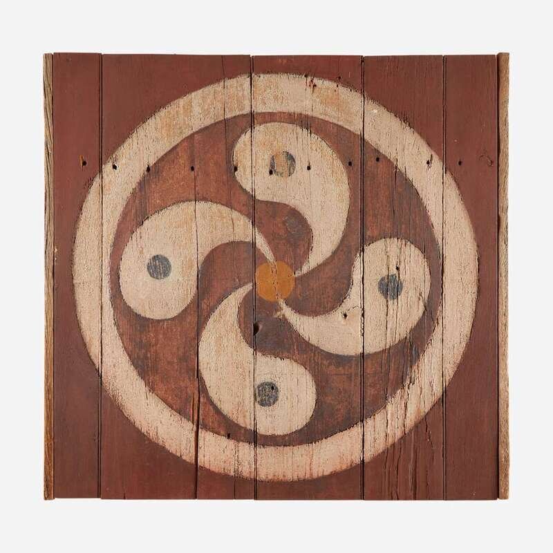 A polychrome painted fylfot Hex sign from barn Pennsylvania, 19th century