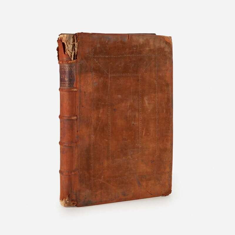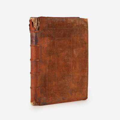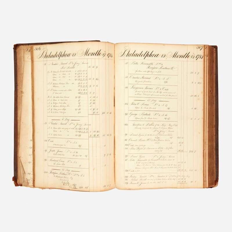 Philadelphia, August 31, 1784-August 23, 1788. Folio. 438 pp. Sundry accounts ledger, written entirely in MS. Belonging to an undetermined Philadelphia merchant, recording hundreds of transactions with numerous individuals and merchant vessels, including itemized lists of imported as well as domestic goods exhanged, payments received, and accounts settled. Original full brown reverse calf, stamped in blind, red morocco spine label, worn and rubbed, spine ends chipped and torn; scattered spotted and soiling to text; first leaf loose, with large circular excision at bottom, other leaves excised.