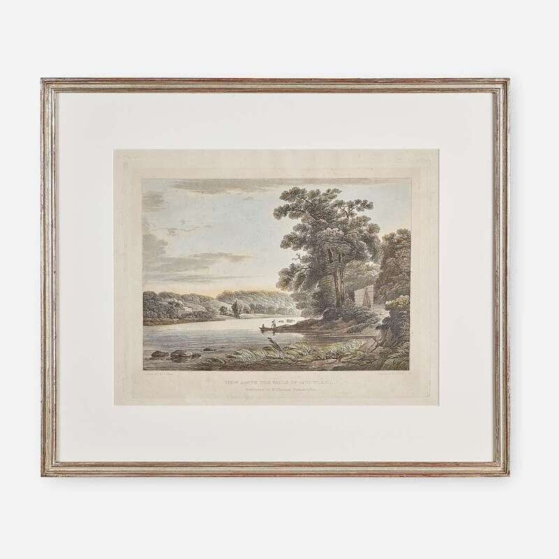 Philadelphia: M. Thomas, (1819). First issue. Hand-colored etching with aquatint. Engraved by J. Hill after a painting by Joshua Shaw. Scattered light spotting. Frame: 20 x 23 1/4 in. (508 x 590 mm); print: 12 7/8 x 16 1/4 (327 x 412 mm) (sight) . Unexamined out of frame. A scarce first issue plate of the Schuylkill River from Joshua Shaw's "Picturesque Views of American Scenery."