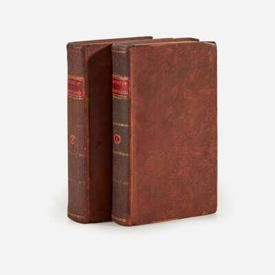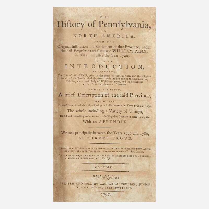 Philadelphia: Zachariah Poulson, Junior, 1797-98. In two volumes. First edition. 8vo. 508; 373, (1), 146 pp. Illustrated with an engraved portrait frontispiece of William Penn in first volume, and large folding map opposite title-page in second volume ("A Map of Pennsylvania Delaware New Jersey & Maryland, With the Parts Adjacent"), with four-inch closed tear. Full contemporary tree calf, stamped in gilt, red morroco spine labels; all edges trimmed; light to moderate foxing in each volume. Contemporary ownership signature of George Massey, 1799, on recto of first free leaf in both volumes; book-plate of George Gordon Massey in first volume; pencil notation, "Geo. V. Massey II, great-great-grandson-" under Massey's contemporary signature in second volume. Evans 32713 & 34421; Howes P-639.