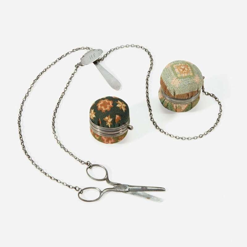 A silver chatelaine with Queen-stitch pin ball Probably Chester County, PA, late 18th/early 19th century