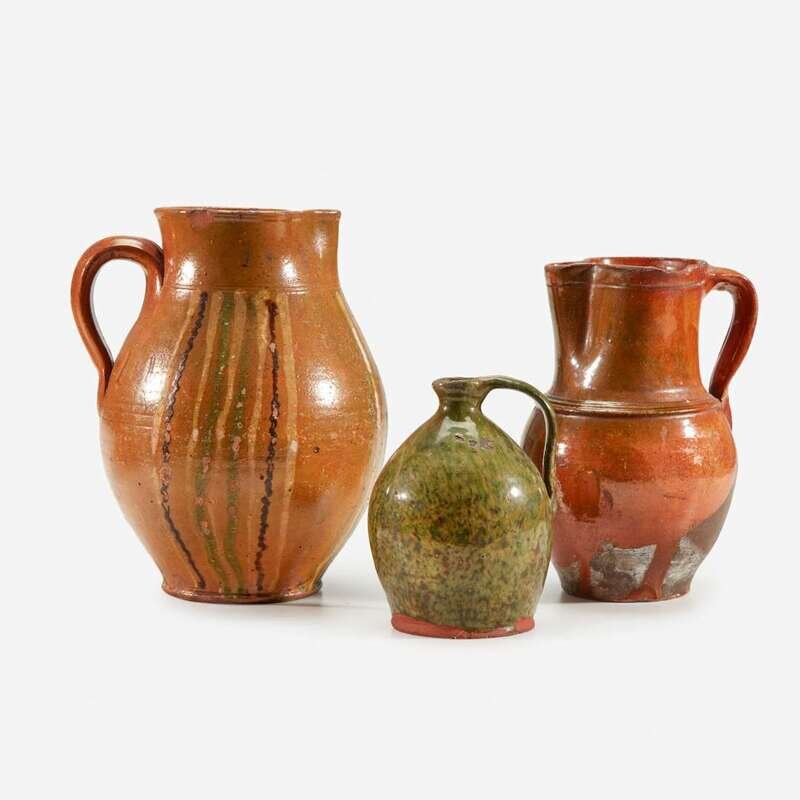 The first pitcher slip-decorated with green, yellow and brown vertical stripes; the second pitcher with green and orange glaze; the jug with mottled green glaze.