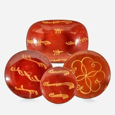 A glazed and slip-decorated redware loaf dish and three slip-decorated redware plates 19th century