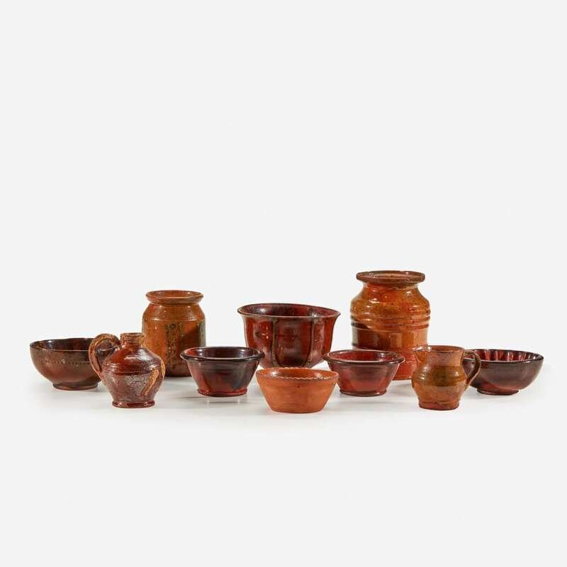 Including a miniature jug dated "1863" in slip; a green and orange glazed miniature pitcher; a pair of manganese glazed bowls; a manganese glazed mold; a small manganese splotched bowl with coggled dots; a jar with green slip vertical lines and dots; a bowl with flaring rim with yellow and manganese stripes and splotches; a ribbed jar; and a custard bowl with notched rim and inscription dated "1887." (10).