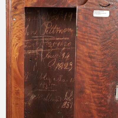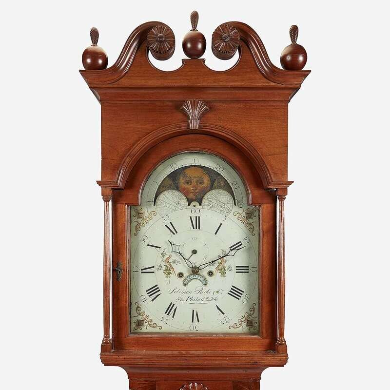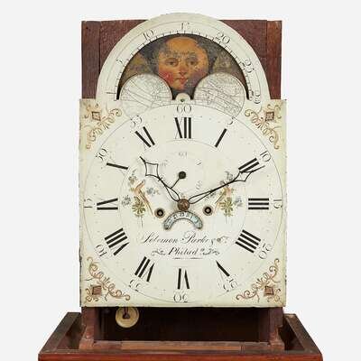 Enameled face with moon phase inscribed, "Solomon Parke & Co./ Phila," works with iron false plate marked, "Osbournes/ Manufactory/ Birmingham," and bell marked, "Gainsworth Warrt."