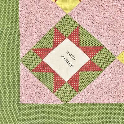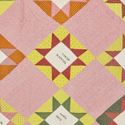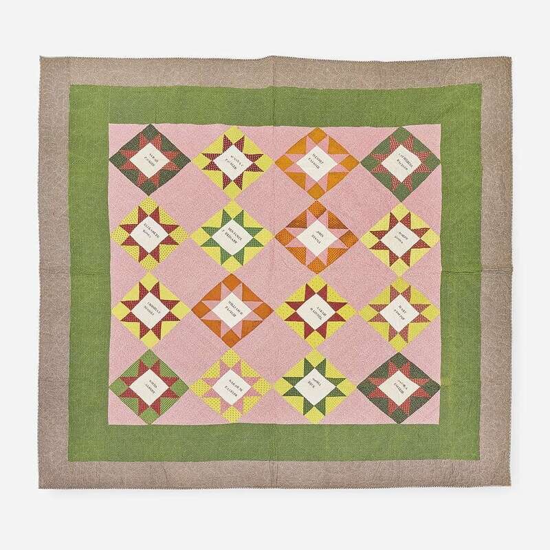 Comprised of printed cotton patches enclosing stamped names belonging to members of the Fackler, Koons, Nissley, Albert, Stouffer, Hainnel, Beck, Raigart and Joseph families, heightened with square, feather, and flowerhead quilting.