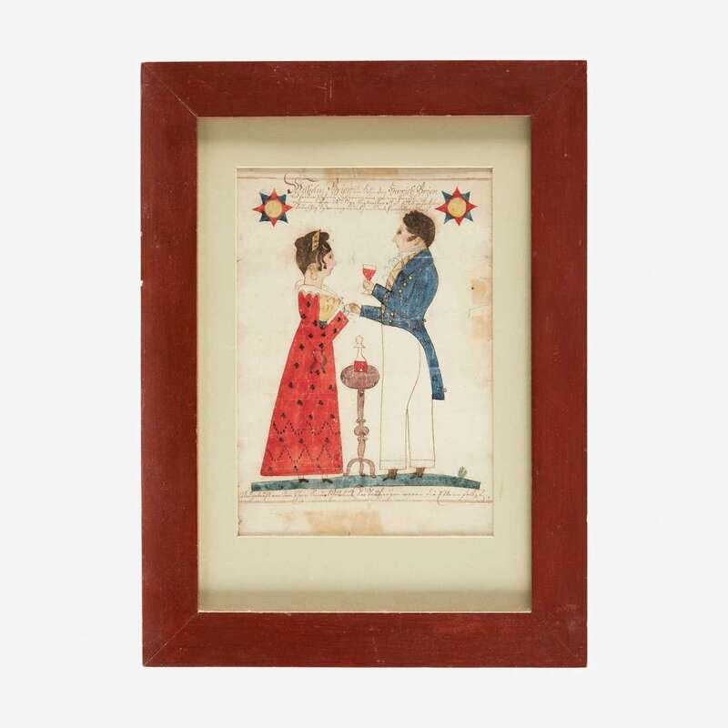 Henry Young (1792–1861) Fraktur: Wilhelmina and Heinrich Brion Toasting Birth, Lycoming County, PA, dated, "1826"