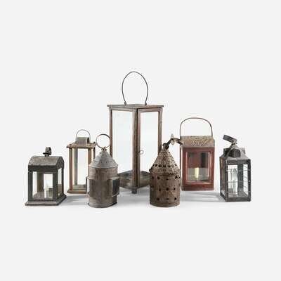 A group of seven painted wood, glass, and punched tin lanterns 19th century
