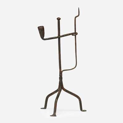 A wrought iron tabletop candlestick with trifid base and penny feet 18th/19th century