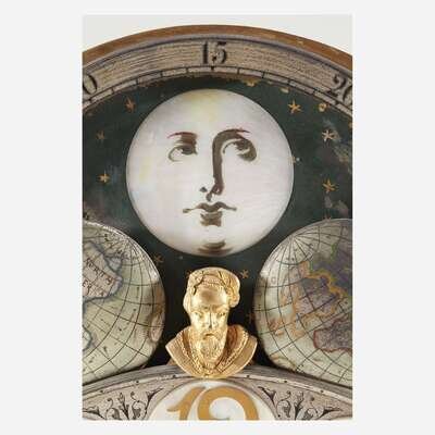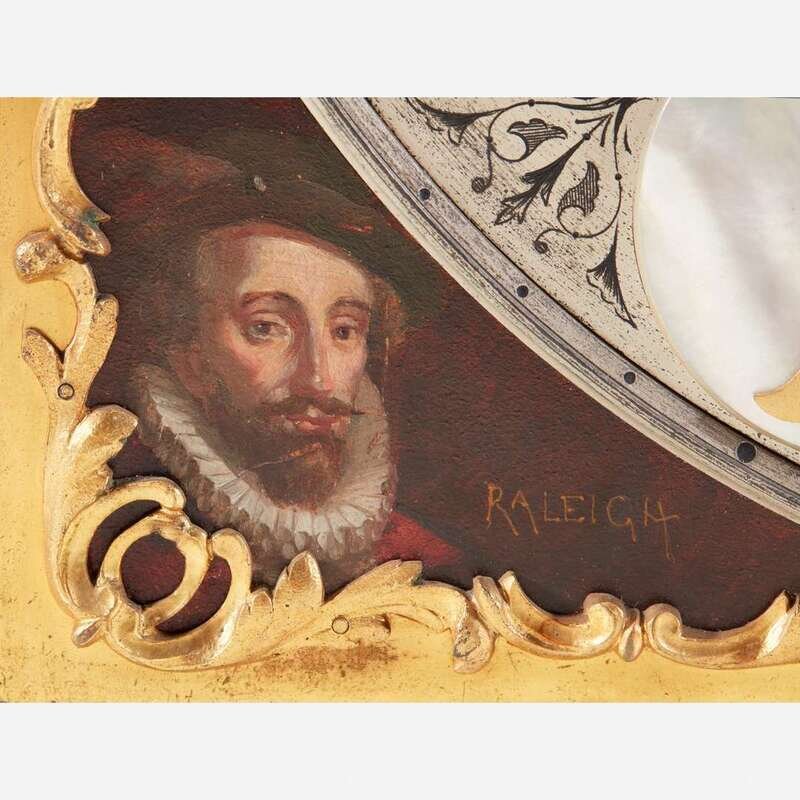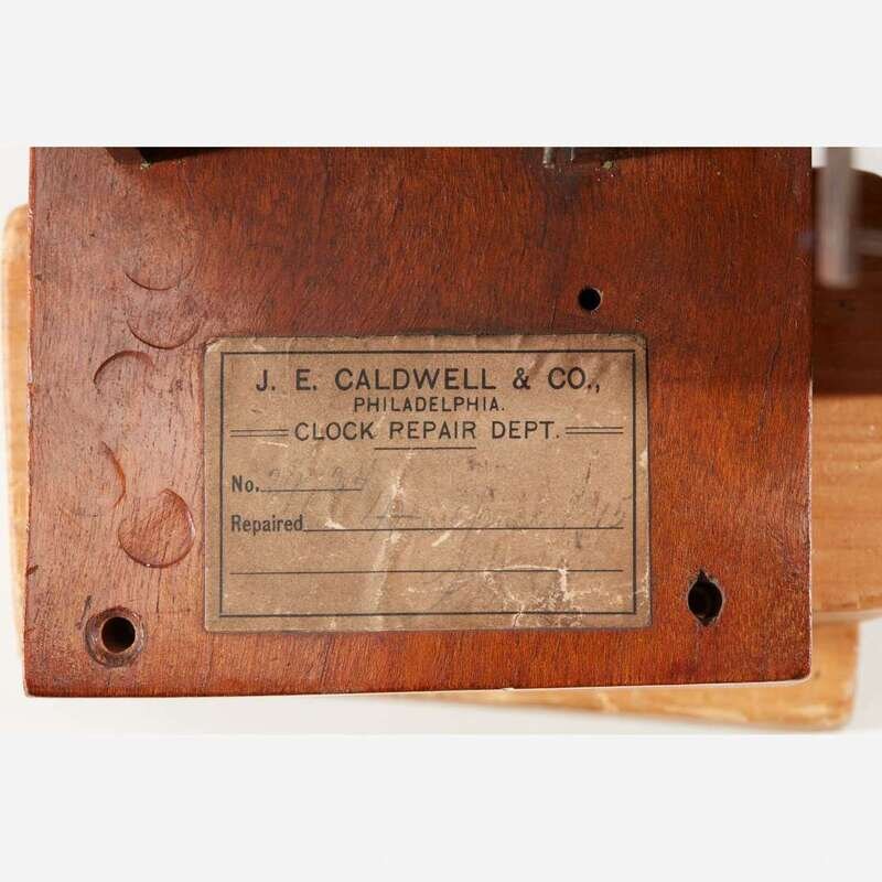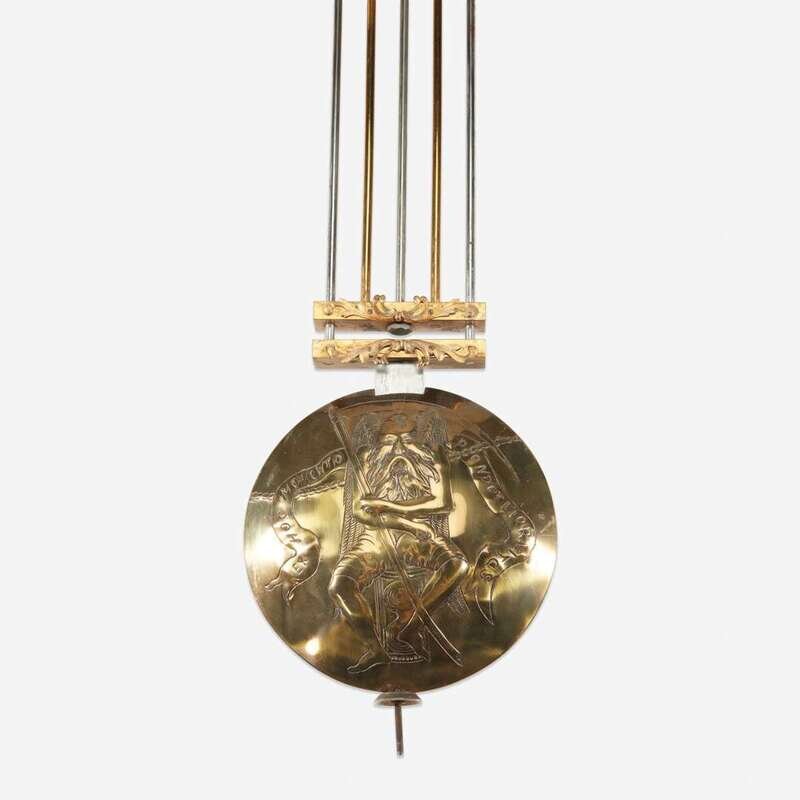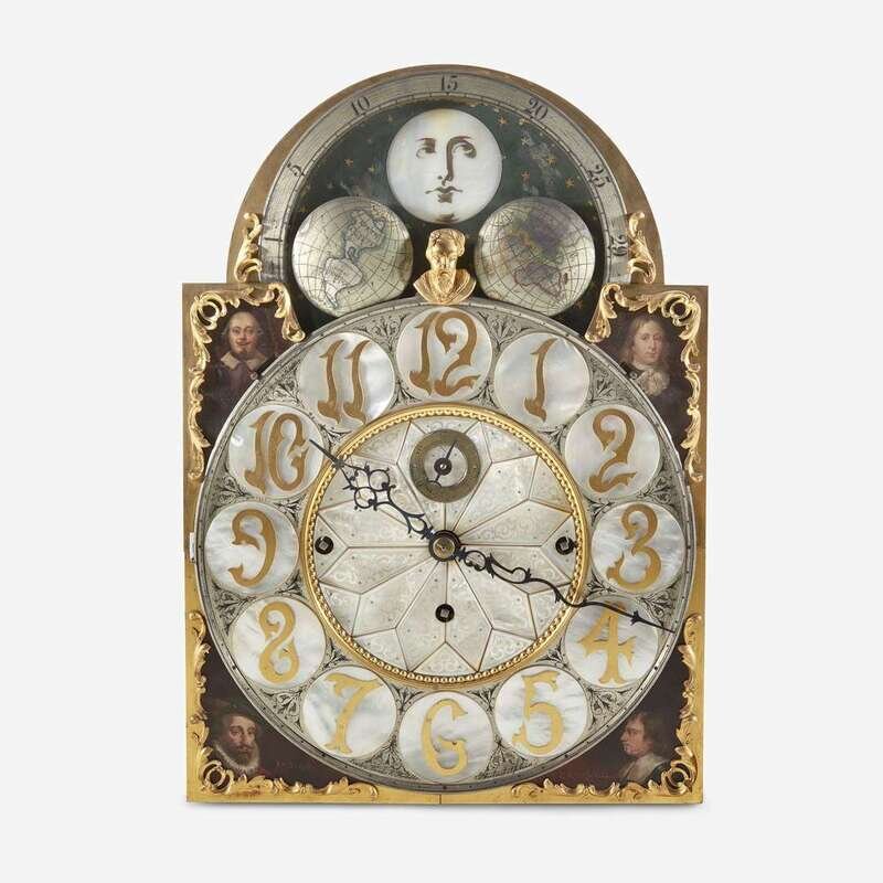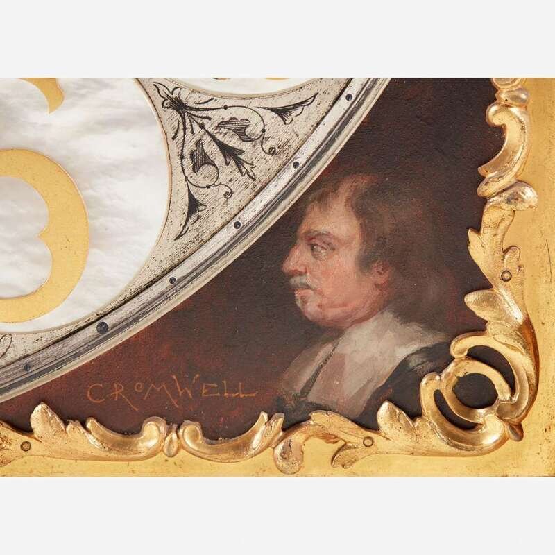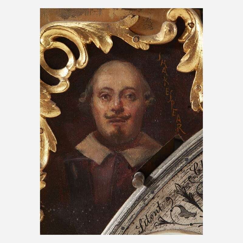 With nine tubular bells, the large pendulum having repoussé figure of Death to disc, and the engraved and painted brass/metal moon dial face with carved and inlaid mother-of-pearl moon and roundels, and painted portraits to spandrels: William Shakespeare, John Milton, Oliver Cromwell, and Walter Raleigh and inscribed, "Bailey, Banks & Biddle, Philadelphia" ; the works marked to back, "Waltr H. Durfee & Co./ Providence RI", and the back of face plate engraved "Made in England."