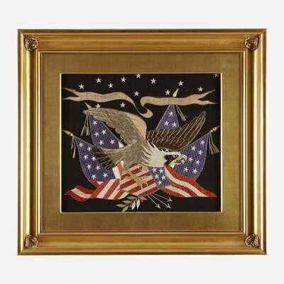 Depicting eagle, American flags, Patriotic shield, and banner; silk on cotton; matted and framed.